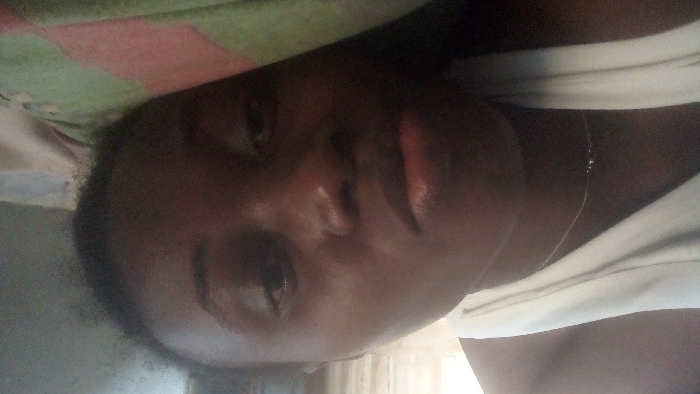 An individual with dark skin, appearing female, is depicted lying on their left side, facing partially towards the camera. They wear a white garment and a thin, silver-colored necklace with small beads. The individual's eyes are open, with a neutral expression. Their head rests on a pillow or bedding featuring a pattern primarily composed of green and red shapes. The background is indistinct, suggesting an indoor environment. This scene takes place in Agunmo, Nigeria.