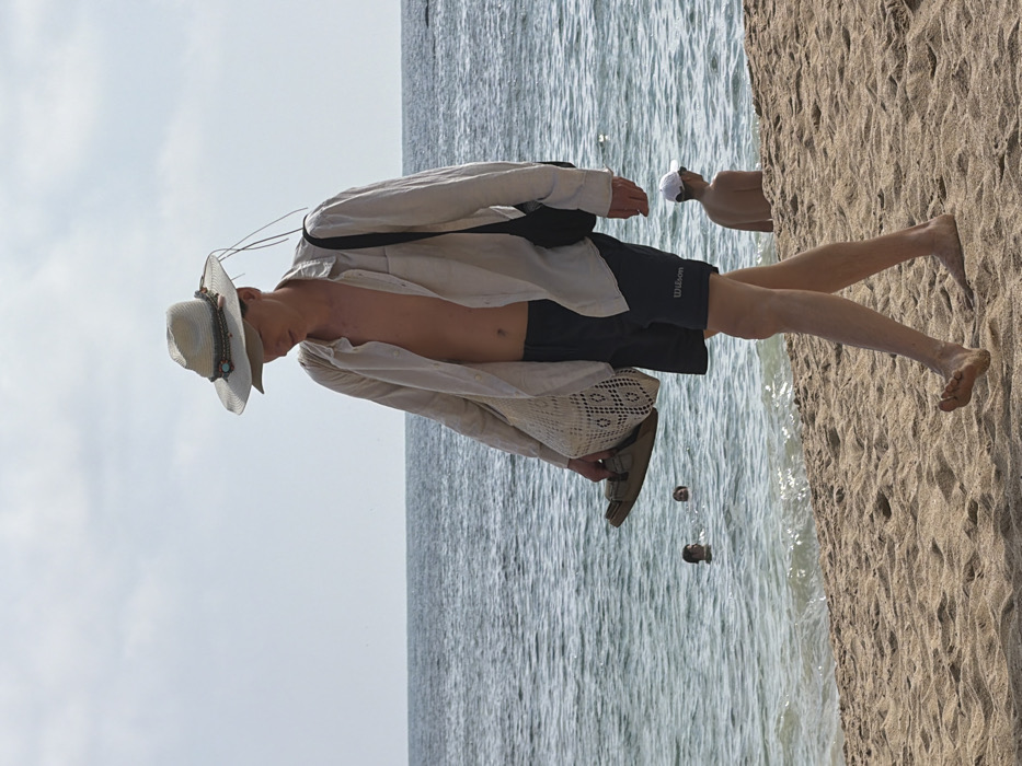 A man in a hat, open white shirt, and black shorts walks along a beach. He wears a sandal on one foot and holds another in his hand. A black bag is slung over his shoulder. The beach stretches to the right of the frame, with the ocean on the left. Another person, shirtless and wearing a white hat, stands partially obscured in the distance. The sky is overcast.