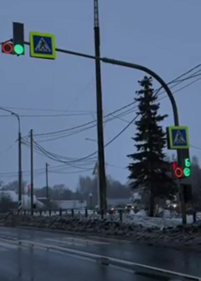 road intersection in what appears to be a rural or suburban area on a gloomy, overcast day. The road is wet, and there are patches of snow along the side. Two sets of traffic lights are visible, both displaying pedestrian crossing signals. On the left, the light shows a red pedestrian signal and a green traffic signal. On the right, the traffic light is counting down from 13 seconds for pedestrians to cross, with both a red pedestrian signal and a green traffic signal illuminated. Above both sets of lights are pedestrian crossing signs. Utility poles and wires run along the side of the road, and a tall communication tower is visible in the background. A pine tree stands near the right set of traffic lights. In the distance, there are houses and other buildings, partially obscured by trees. Traffic can be seen in the distance as well.