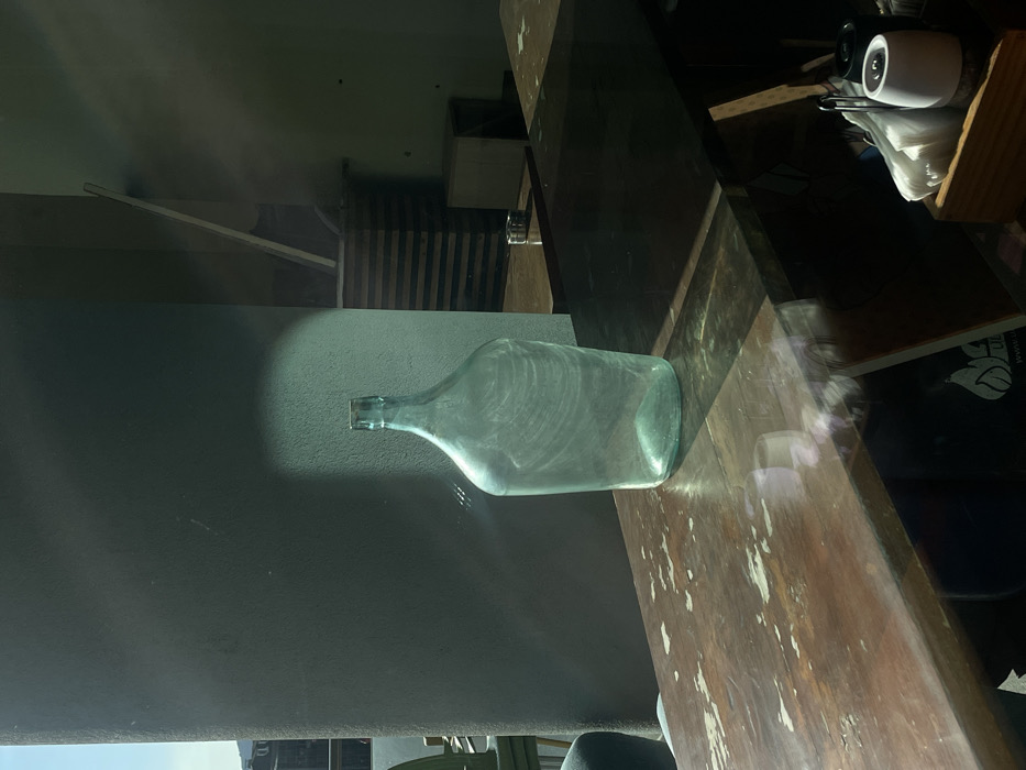 The image displays an indoor scene, likely a commercial establishment such as a cafe or restaurant, located in Sofia, Bulgaria. A large, clear, light blue-green glass demijohn bottle with a narrow neck, approximately 50-60 cm in height, stands prominently on a dark brown wooden countertop. The countertop shows significant surface wear, with lighter areas indicating worn-off finish. Swirl patterns are visible on the bottle's glass. Behind the bottle, a light grey textured wall is partially illuminated by a circular patch of direct sunlight, which casts a subtle greenish-blue hue. To the left of this wall, an exterior view through an opening or window reveals a clear blue sky and indistinct elements of distant buildings, along with a partial view of a dark chair. To the right of the wall, a darker interior space is visible, containing a stack of horizontal wooden slats or shelves, a long, thin, light-colored object leaning vertically, and a small cardboard box on the floor. In the lower right foreground, on a darker section of the wooden counter, a wooden condiment caddy holds white wrapped items (possibly napkins or cutlery) and two white cylindrical shakers. Strong sunlight creates defined shadows and bright highlights across the wooden surfaces. No individuals are present in the scene.