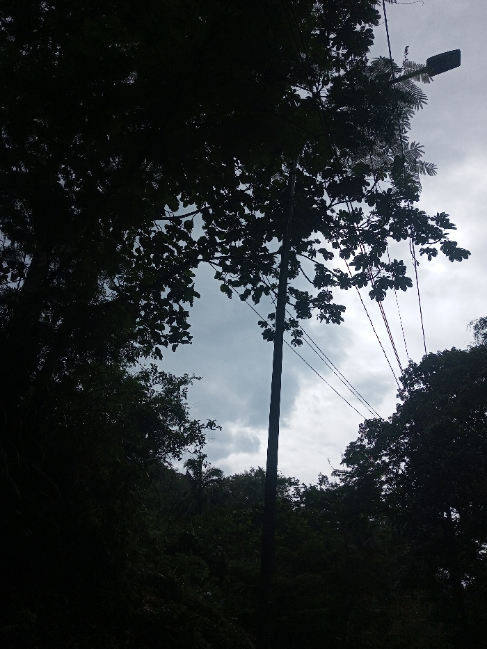 The image depicts a heavily forested area in Lunugamwehera, Sri Lanka, under an overcast sky. The scene is largely silhouetted, with dark foliage dominating the foreground and sides. A prominent, dark utility pole stands centrally, extending vertically through the frame. Multiple dark power lines are visible extending diagonally downwards from the pole towards the right, disappearing into the dense tree canopy. A rectangular street light fixture is attached to the upper right section of the utility pole, partially obscured by tree branches. The sky above is a mix of grey and lighter white clouds, suggesting an overcast day. No individuals, animals, or artificial structures other than the utility pole and street light are discernible.