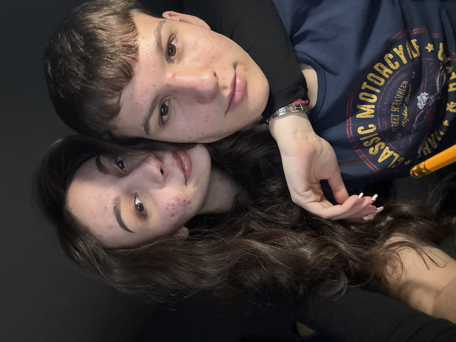 The scene takes place in the city of Kozloduy, Bulgaria. The image features two young individuals, one female and one male, posed closely together and looking directly at the camera. The female, positioned on the left, has long, wavy dark brown hair and wears a dark, long-sleeved top. Her right arm is draped around the male's neck and shoulder, with her right hand, featuring manicured nails with white tips, resting on his left shoulder. Her face displays light skin with visible acne and blemishes, particularly on the left cheek. The male, positioned on the right, has short, dark brown hair and wears a dark blue t-shirt emblazoned with a "CLASSIC MOTORCYCLE STREET SCRAMBLER" graphic. His left wrist is adorned with a silver-colored link bracelet and a red string bracelet. His face also exhibits light skin with visible acne and blemishes, and a small reddish mark is present on the bridge of his nose. In the lower-right foreground, a yellow wooden pencil with an orange tip is visible. The background is uniformly dark and out of focus, indicating an indoor setting with frontal lighting.
