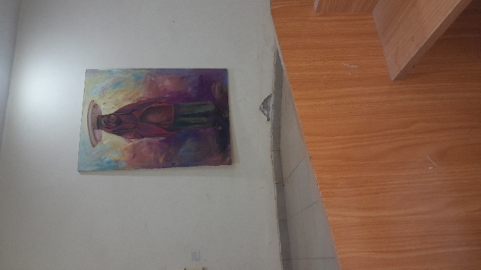 The image presents an interior scene within the city of Lafia, Nigeria. A rectangular oil painting is mounted on a light-colored wall, depicting a dark-skinned human figure in a reddish-brown garment, balancing a light-colored circular object on its head. The painting features a multi-colored abstract background. To the left of the painting, a light-colored electrical outlet or switch plate is visible on the wall. Below the painting, at the base of the wall, an irregular patch of damaged wall material is present. The floor consists of light grey square tiles, transitioning to a sloped section with a dark grey curved perimeter. In the foreground, a vertical wooden panel with a distinct grain pattern is positioned to the right, alongside a single wooden stair tread extending from the bottom right corner. An overhead light source illuminates the upper central portion of the wall. No live individuals are present in the scene.