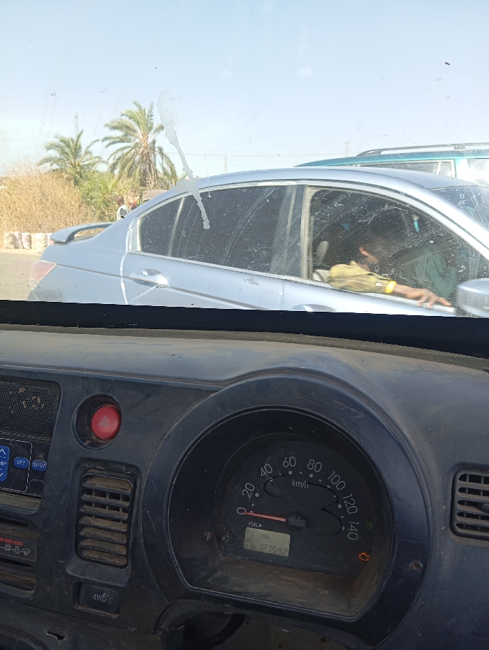 The image presents a forward-facing view from the interior of a stationary vehicle onto a street in Agingi Zion, Nigeria, under a bright daytime sky. The immediate foreground displays a dusty black dashboard featuring a prominent red hazard warning button, a speedometer indicating 0 km/h, and a fuel gauge nearing empty. An odometer registers 127542 km, and a check engine light is illuminated. The label "4WD" is visible below an air vent. The windshield itself is marked with smudges and dirt, including a distinct white drip mark. Outside the observer's vehicle, to the right, a silver four-door sedan, consistent with a Honda Accord, is parked or idling. Its windows are heavily tinted. A person occupies the front passenger seat of the silver sedan, wearing a yellow shirt and a yellow bracelet on their left wrist, with their arm resting on the open window frame. In the background, to the left of the sedan, are two distinct palm trees, dry light-brown vegetation, and concrete roadside barriers. A portion of a second vehicle, colored teal, is visible further in the background to the right.
