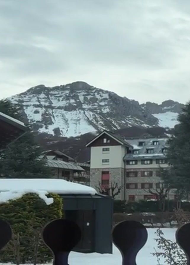 The scene is a daytime view of a mountain range with snow cover, framed by buildings and trees