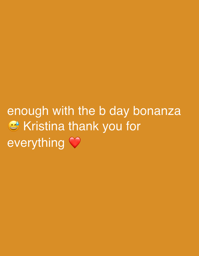 A warm, orange background displays white text expressing gratitude. The message reads, "enough with the b day bonanza 😂 Kristina thank you for everything ❤️". Emojis punctuate the text, adding a touch of lightheartedness and affection. The phrase suggests a potential overabundance of birthday celebrations, with a heartfelt thank you directed towards a person named Kristina.