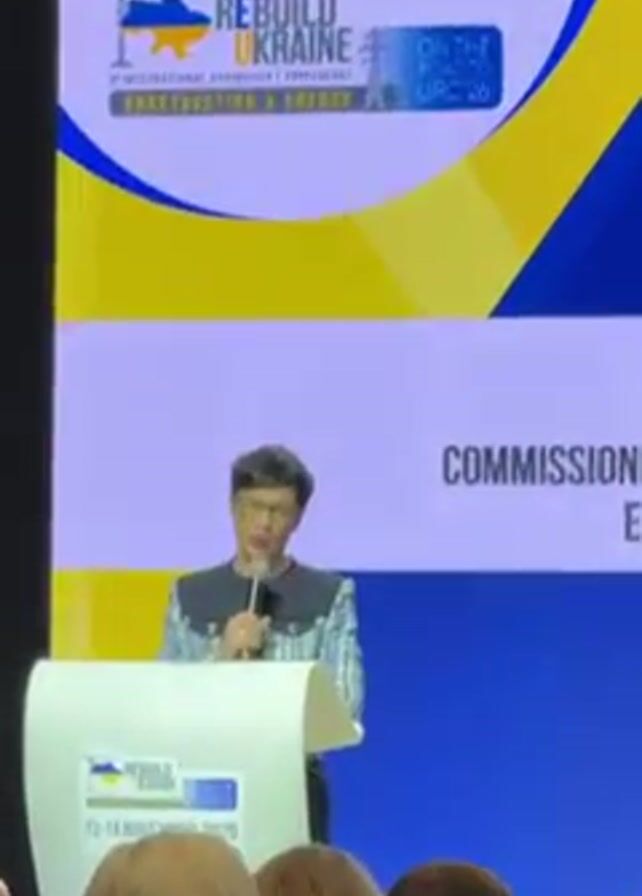 A woman with short dark hair, glasses, and a navy and white tweed jacket is speaking at a podium. She holds a microphone in her left hand and gestures with her right. The podium is white with a logo that reads "REBUILD UKRAINE" and dates "13-14 NOVEMBER 2025." Behind her is a large screen displaying her name and title, "MARTINA" and "COMMISSIONER FOR ENLARGEMENT EUROPEAN." The background of the screen is blue and yellow. In front of the podium, there is an audience. Some people are taking pictures with their phones. There is a woman in the audience with blonde hair facing away from the camera and a woman in a black jacket facing to the left of the camera. There are lights and a camera overhead.
