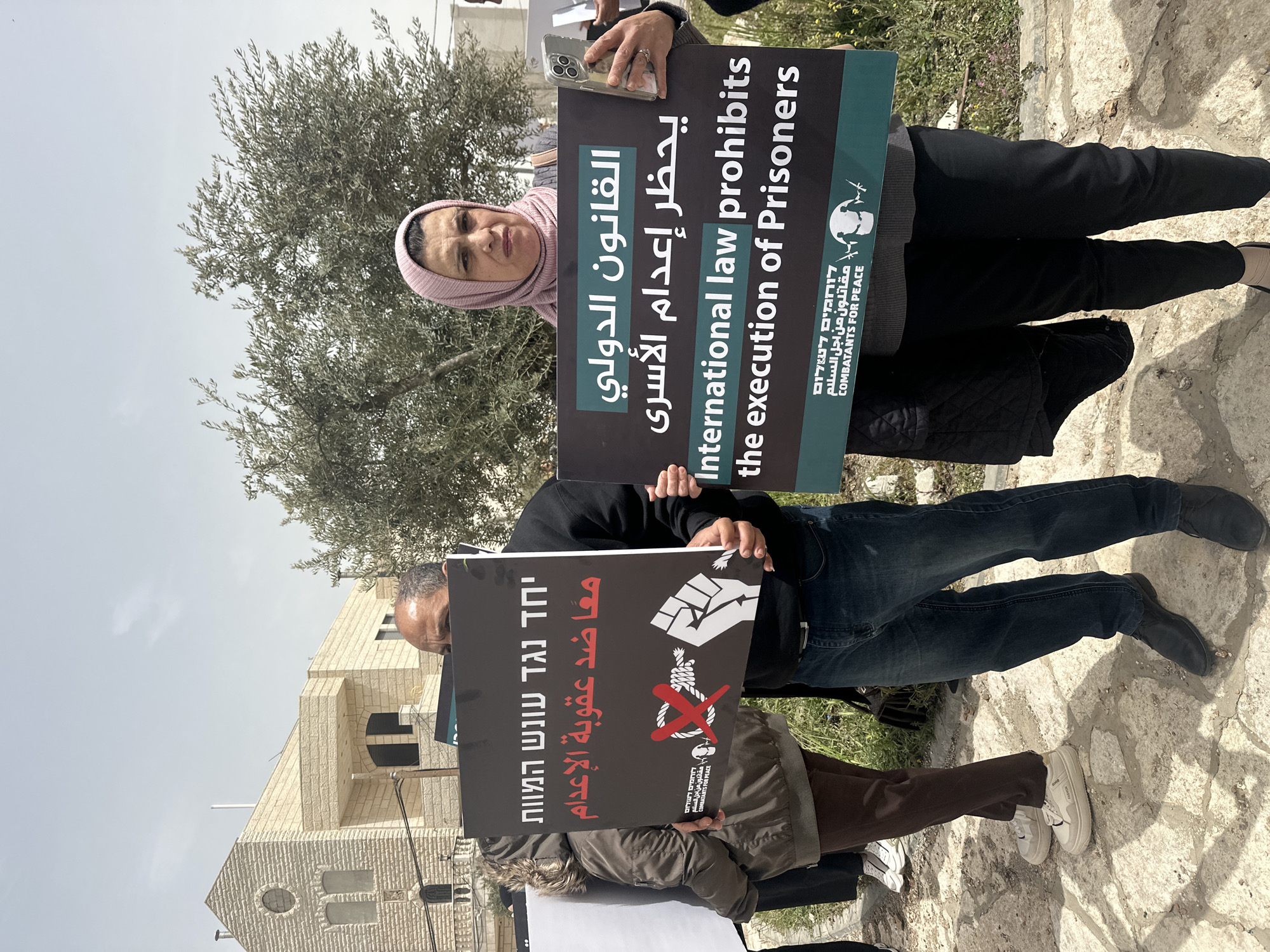 The image depicts three people protesting in what appears to be an outdoor setting, possibly in the city of a-Doha in the Palestinian Territory, based on the signage. The first person, possibly a woman, is wearing a headscarf and holding a sign with text in Arabic and English that reads "International law prohibits the execution of prisoners." The second person is holding a similar sign in Arabic and possibly Hebrew or another language used in the region. The sign also contains a graphic depicting a fist and a noose with a red X. The third person is partially visible and is holding a blank poster. The setting includes what appears to be a stone building in the background, suggesting an urban or suburban environment, and there are trees in the vicinity. The protesters appear to be standing on a paved area.