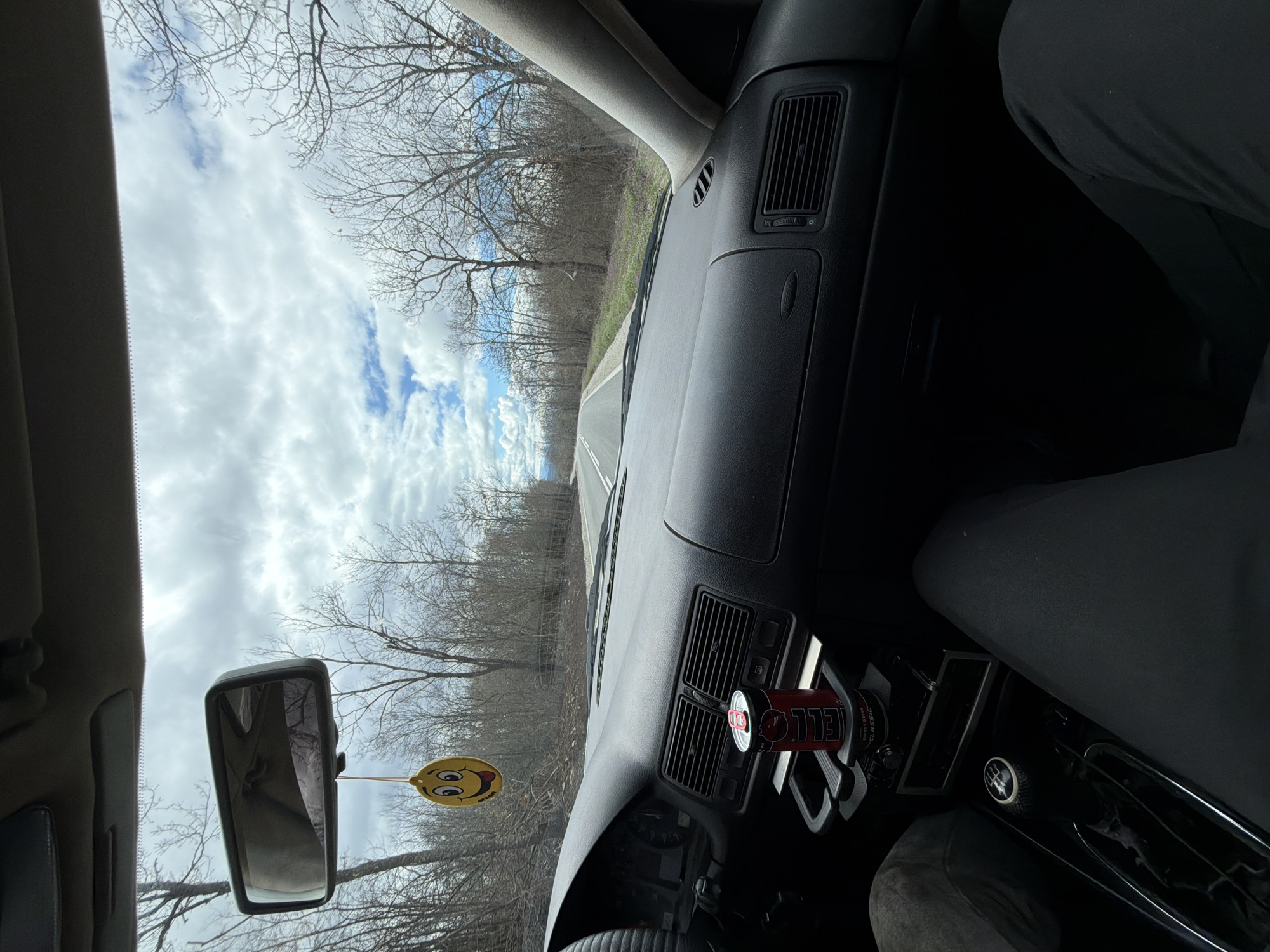 The image presents a forward-facing view from inside a moving vehicle on a paved road near Lukovit, Bulgaria. The dark grey dashboard occupies the mid-ground, featuring air vents and a central cup holder containing a red "Hell Classic Energy Drink" can. Below the cupholder, a manual transmission gear stick is visible. A rearview mirror hangs centrally from the headliner, with a yellow smiley-face air freshener suspended below it. Partially visible on the left is the driver's leg, clad in grey pants, while the passenger's legs, wearing dark trousers, are visible on the right. Outside the windshield, a two-lane road with white markings recedes into the distance, flanked by dense clusters of bare deciduous trees on both sides, indicative of late winter or early spring. The sky is largely overcast with scattered patches of blue visible through the clouds.