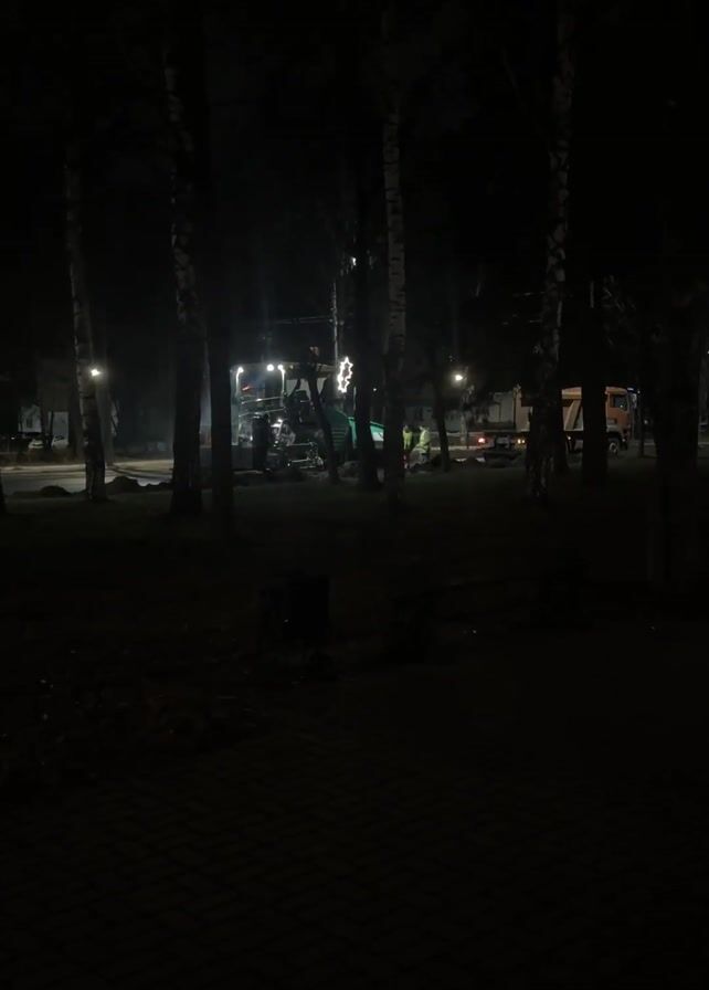 At night, a dark park is lit by streetlights and construction equipment. Silhouetted trees frame the scene. A road construction crew wearing bright safety vests operates a large, green asphalt paving machine. A truck is parked behind the crew. The camera is static.