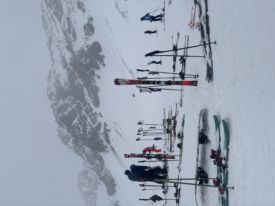 The scene depicts a snow-covered alpine environment in Klösterle, Austria, under overcast skies with visibility diminishing towards the distant, rugged mountain peaks. The foreground and mid-ground consist of an expansive snowfield serving as an active ski area. Approximately 10 to 15 individuals are present, all dressed in full winter ski attire, including jackets, pants, helmets, and goggles. Numerous pairs of skis and ski poles are scattered throughout the snow; many skis are planted vertically, while others lie horizontally. One snowboard is clearly visible, resting flat on the snow in the lower-left foreground. In the left-center, two individuals are standing near a cluster of upright skis; one person in a dark jacket and blue helmet appears to be interacting with or adjusting equipment. A person in an orange jacket is positioned slightly behind them. Other individuals are distributed across the snowfield; some are standing stationary, while others are in active motion on their skis, such as a person in a blue jacket on the right side of the frame, actively skiing downhill with poles. The overall environment is a high-altitude, snow-covered mountain slope.