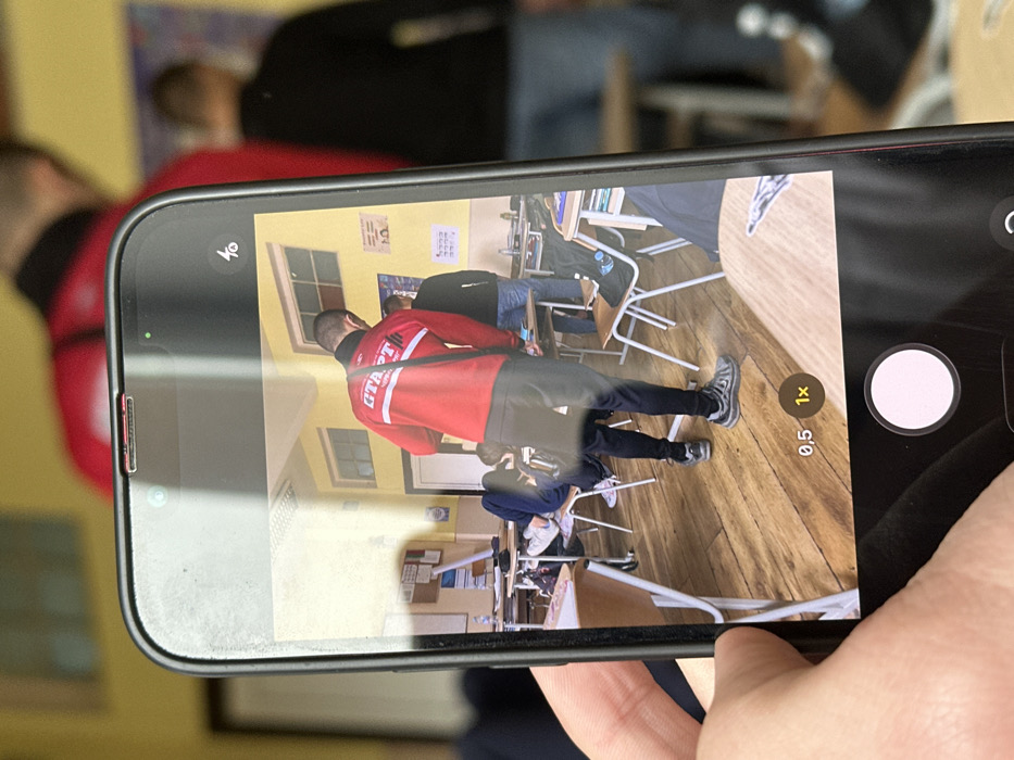 A light-skinned hand holds a black smartphone, likely an iPhone, in a close-up, slightly angled shot. The phone's screen displays a live camera view of a classroom in Cherven Bryag, Bulgaria. The camera interface shows a white circular shutter button at the bottom, "0.5x" and "1x" zoom options, and a flash icon. A small green dot indicates active camera usage near the phone's top notch. The classroom scene within the phone's display features yellow walls and a light-colored wooden floor. Multiple wooden desks with metal frames and matching chairs are arranged. In the foreground-center of the screen, a male individual stands with his back to the viewer. He wears a red long-sleeved jacket with a white "СТАРТ" (START) logo on the back, black athletic pants, and grey-and-black athletic shoes. A black shoulder bag is visible. To the left, another individual is seated, slumped over a desk, with their feet resting on the back of a chair in front of them. To the right, a second male individual stands with his back to the viewer, wearing a black long-sleeved shirt and blue jeans. A black backpack is on a chair beside him. The classroom background includes multiple-pane windows, a bulletin board with papers, and various posters or diagrams on the yellow walls. Outside the phone's display, the background is blurred, revealing a yellow wall and indistinct figures, including a person in a red top and another in a black top, consistent with the individuals captured on the phone's screen.