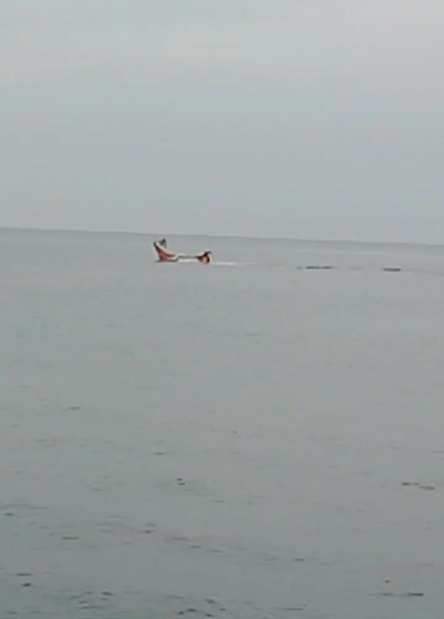 In a distant wide shot, an orange boat with what appears to be two people is seen on a calm, gray sea. The sky is overcast and the horizon is blurred. The boat is moving away from the camera, leaving a small wake behind.
