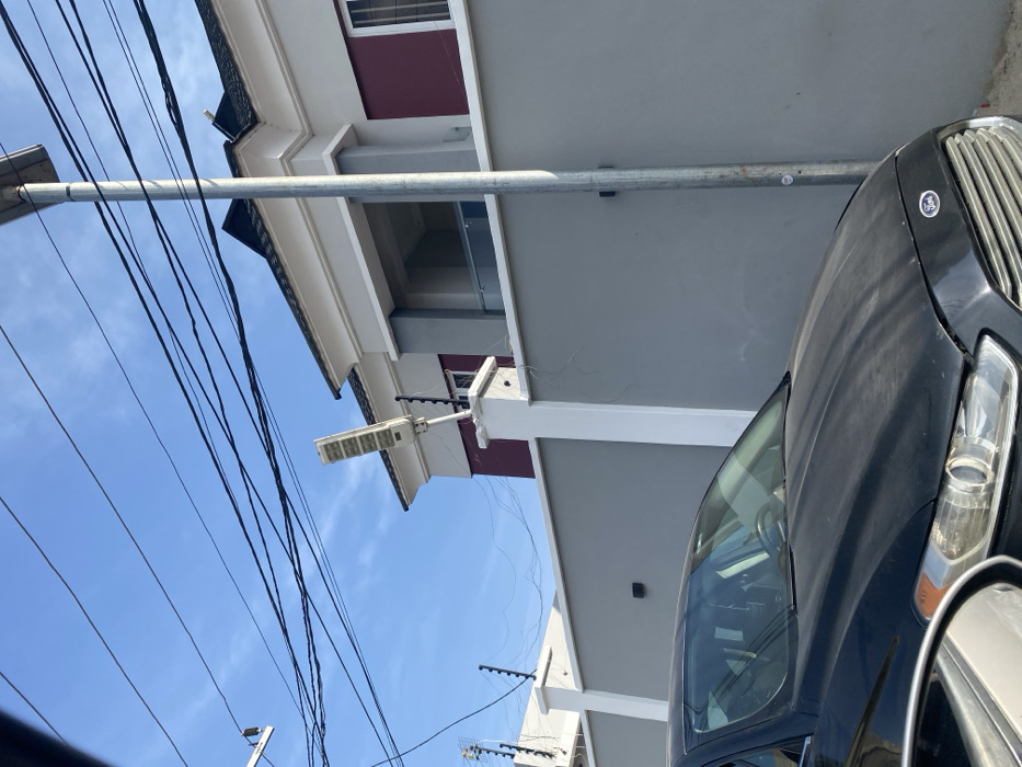 The scene depicts a daytime street view in Alaguntan, Nigeria. A black Ford sedan occupies the lower foreground, presenting its hood and front windshield. Ahead of the vehicle is a light grey perimeter wall, topped with white pillars and an active electric fence system featuring insulators and wires. A tall, silver-colored metal pole, fitted with an LED luminaire, stands to the right of the Ford, adjacent to the wall. Another LED luminaire is mounted on a white pillar of the perimeter wall. Behind this wall, a modern two-story building is visible, characterized by a dark grey roof, light grey and white architectural trim, and deep maroon-colored sections on its exterior walls. The building features a balcony with a glass railing. Overhead, numerous black utility wires crisscross a clear blue sky. No individuals are visible.