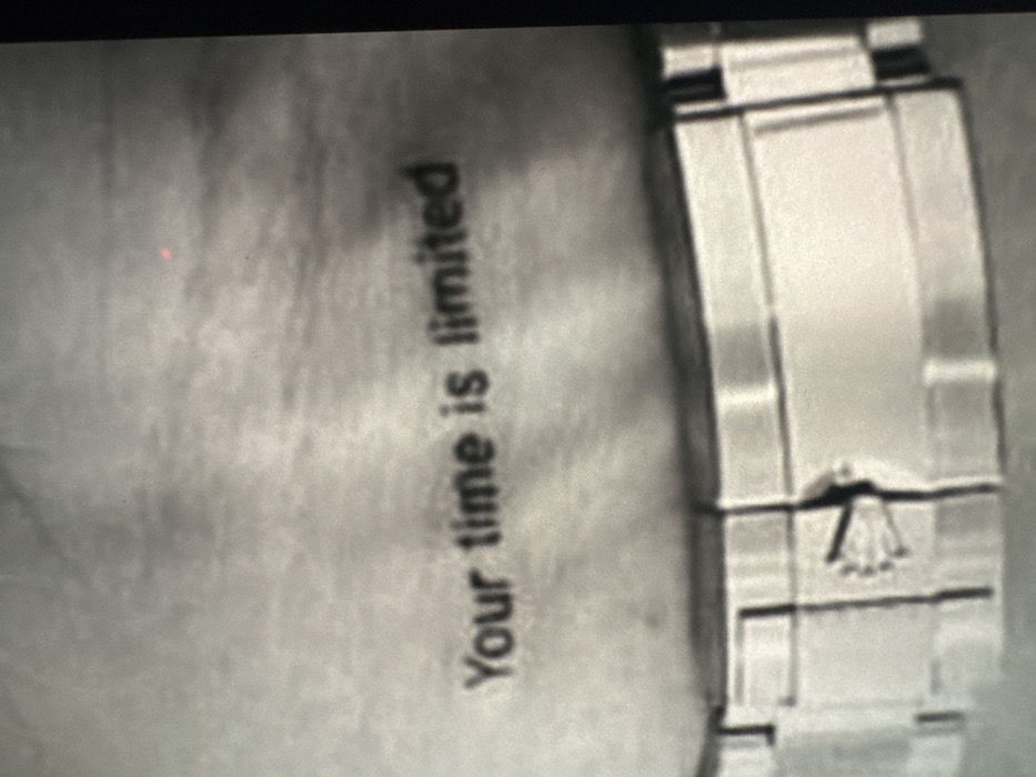 wrist with a tattoo and a watch. The tattoo reads "Your time is limited" in a simple sans-serif font. Beside the tattoo is a metal Rolex watch with a visible clasp, adding a stark juxtaposition to the tattoo's message about mortality. The photograph is taken in black and white, enhancing the starkness of the message and the metallic sheen of the watch.