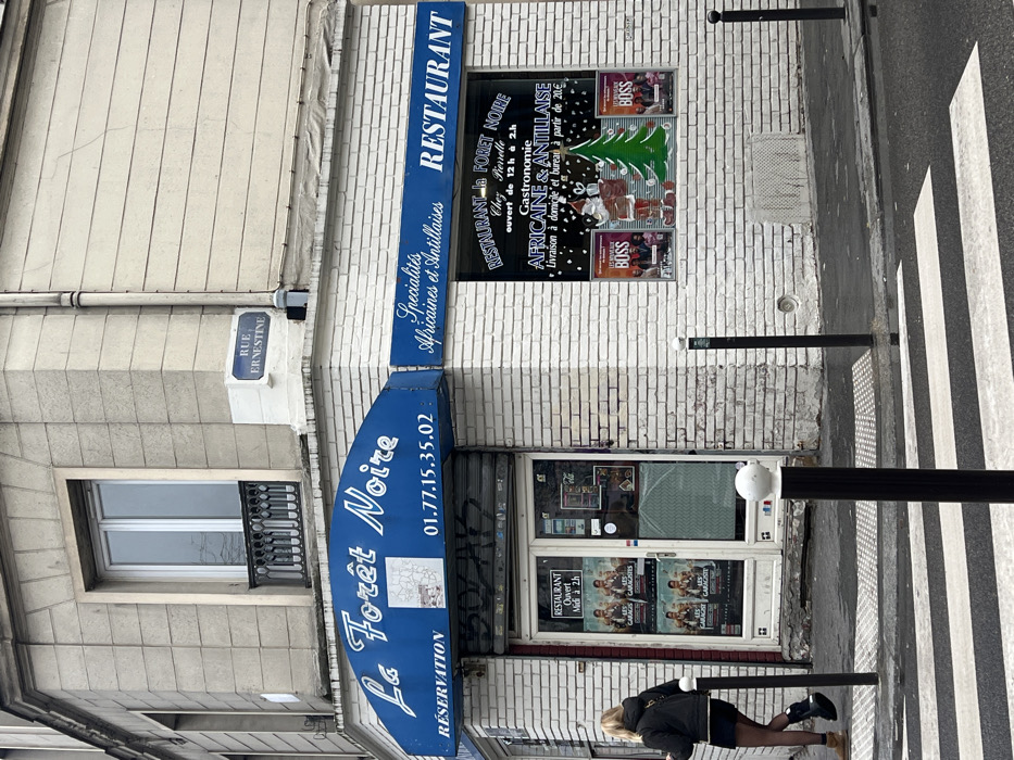 The scene depicts the exterior of a corner building at Rue Ernestine in Paris, France. The ground floor houses a restaurant named "La Forêt Noire," specializing in African and Antillean cuisine. The restaurant features a light-colored brick facade, a blue awning over its entrance displaying "La Forêt Noire," "RÉSERVATION," and phone number "01.77.15.35.02." A blue sign above the main window also advertises "Specialités Africaines et Antillaises" and "RESTAURANT." The restaurant's large corner window displays internal decorations, including a prominent Santa Claus cutout, a green Christmas tree cutout, and two posters for "LES NOUVEAUX BOSS." Additional text on the window indicates "RESTAURANT La Forêt Noire Chez Pierrelle," opening hours "ouvert de 12 h à 2 h," "Gastronomie AFRICAINE & ANTILLAISE," and "Livraison à domicile et bureau à partir de 20€." The double-leafed front door is adorned with multiple posters, including "LES GARAGISTES." Above the ground floor, the building transitions to a grey stone facade with two upper-story windows, one featuring a black decorative metal balcony railing. A blue street sign displaying "RUE ERNESTINE" is affixed to the upper facade. On the sidewalk in the foreground, a blonde individual walks from left to right, away from the camera. They are wearing a dark jacket, a short dark skirt, dark tights, and two-toned boots (tan and black), while holding a small dark object in their left hand. The street surface is wet, and a pedestrian zebra crossing is visible in the foreground, bordered by several black bollards with white tops.