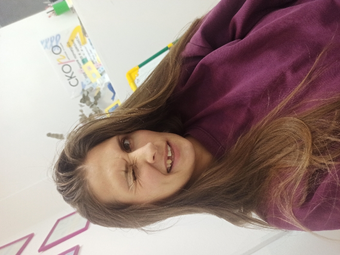 An indoor portrait-style photograph depicts a female subject with long, wavy brown hair, wearing a solid dark purple crew-neck sweatshirt. She winks her left eye, furrowing her brow, and smiles with her mouth slightly open, revealing a visible gap where an upper front tooth (incisor) is missing. The background consists of a plain white wall. On the left side, two empty pink rectangular frames or decorative borders are mounted. On the right, a white banner or sign is displayed, featuring Cyrillic text. The prominent word "СКОРО" (SOON) is visible, followed by smaller text indicating "открытие нового" (new opening). Below this text, colorful graphics resembling children's art supplies, such as scissors, geometric shapes, and a ruler, are present. To the far right, a green cylindrical holder containing writing utensils is partially visible on an unseen surface, along with a portion of a yellow and green structure, possibly an easel or play equipment. Based on the textual and visual cues, particularly the banner announcing a "new opening" with child-related graphics, the scene is located within a children's development center, creative studio, or a similar educational/activity-focused establishment in the city of Irkutsk, Russia. The precise address within Irkutsk is not discernible from the image.