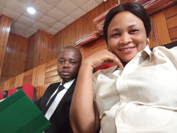The image displays two individuals, an adult female and an adult male, seated in an interior space identified as being within Unguwan Dosa, Nigeria. The female, positioned in the foreground on the right, has dark hair, a light brown complexion, and is wearing a light-colored, collared short-sleeved shirt. She presents a broad smile towards the camera, with her left hand resting near her chin. Gold-colored stud earrings are visible on her right earlobe. The male, positioned behind and to the left, has dark skin, short dark hair, and is attired in a black suit, white shirt, and a dark tie. He maintains a neutral expression while looking directly at the camera. He holds a green, textured binder in his left hand, which partially obscures his lower torso. The background features light brown wooden paneling arranged horizontally on the walls. Sections of red upholstered seating are visible behind both individuals. The ceiling is light-colored with a grid pattern, featuring a single circular white light fixture in the upper left quadrant. Stacks of documents or folders with varied colored spines (orange, red, white) are visible on a surface in the upper right background.