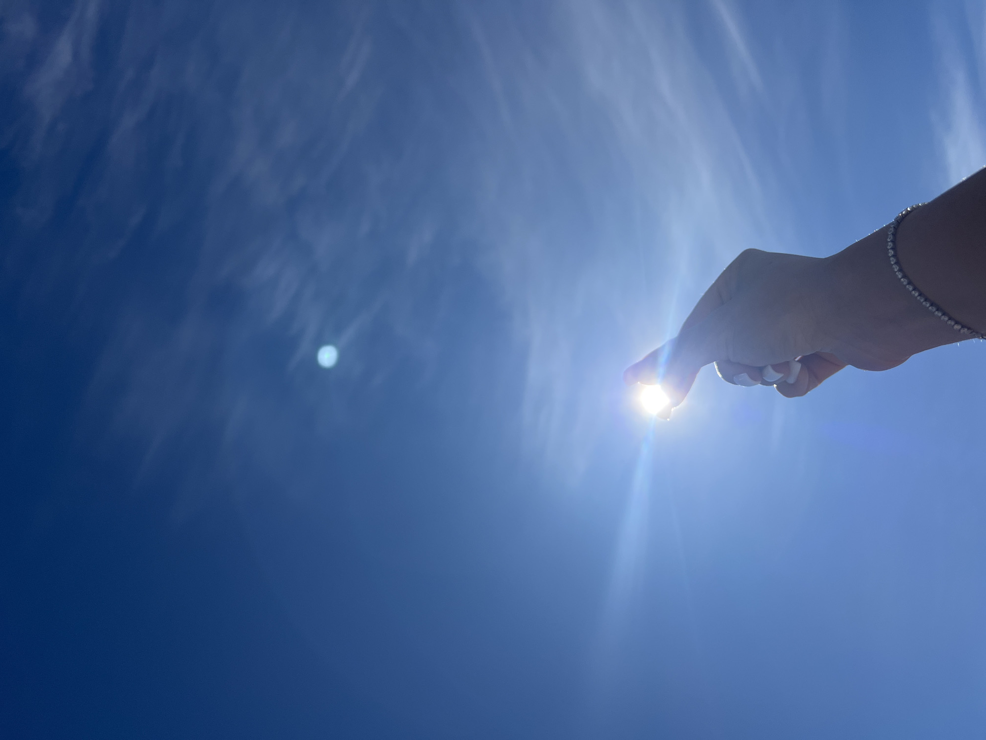 A close-up shot captures a hand pointing directly into the sun against a bright blue sky with subtle wisps of clouds. A tennis bracelet adorns the wrist. The location is not discernible in the image.