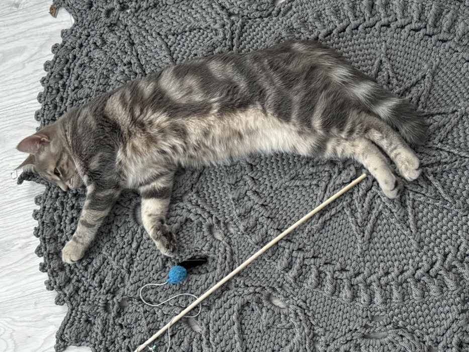 In an indoor setting in Зура, Russia, a grey tabby cat with darker grey stripes and a lighter cream underside is lying stretched out on its left side on a dark grey, elaborately crocheted blanket. The cat's head is turned to its right, facing away from the camera, with its eyes appearing closed or in a relaxed state. Its front and hind paws are extended. To the left of the cat's head, a cat wand toy is visible, featuring a long, light-colored wooden stick with a white string attached to its end, which in turn holds a small blue pom-pom and a black feather. The patterned blanket, which exhibits a complex, raised stitch design, rests on a light-colored floor, likely wood or laminate, visible around the blanket's perimeter. The scene depicts the cat in a state of rest.