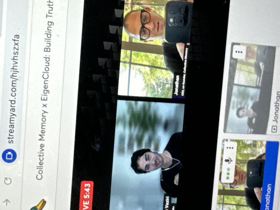 The image displays a tilted, glare-affected computer screen, presumed to be located in Erba, Italy, showing a live online video conference. The browser bar indicates the URL "streamyard.com/hjhvhszxfa" and a title "Collective Memory x EigenCloud: Building Truth". A "LIVE 5:43" indicator is visible on the video stream. The primary visual content consists of four video panels: 1. **Top-left panel:** A young adult male with dark hair, a beard, wearing a dark shirt and white wired earphones, looking directly at the camera with a slight smile. His name is partially visible as "Vaziri." The background is a blurred light wall with some green foliage. 2. **Top-right panel:** A bald adult male wearing glasses and a dark shirt, holding a dark-colored smartphone (specifically an iPhone Pro model, identifiable by its camera array) in front of him, which reflects his face. He is identified as "Jonathan, CEO, co-founder, Collective Memory." His background features lush green trees visible through a large window. 3. **Bottom-left panel:** A smaller thumbnail of the same bald male, "Jonathan," also holding the smartphone. A blue overlay bar displays his name, with microphone and three-dot option icons overlaid. 4. **Bottom-right panel:** Another smaller thumbnail showing a person (likely Jonathan again) inside what appears to be a vehicle, with window frames visible. His name "Jonathan" is displayed below this panel. The scene depicts multiple participants engaged in a digital conversation or broadcast, with one individual notably using a smartphone as part of his participation.