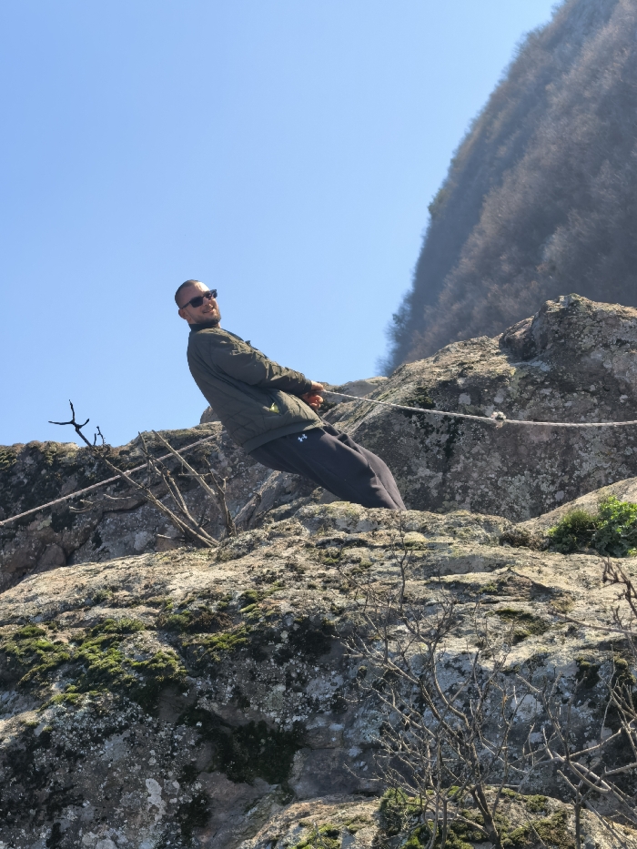 The image captures an adult male on a rocky outcrop in Ustina, Bulgaria, under a clear blue sky. The subject, with a shaved head, beard, and dark sunglasses, is wearing a dark olive green quilted jacket over a dark long-sleeved shirt and dark athletic pants featuring a white logo on the left thigh. He is leaning backward at a steep angle, supported by a thick, light-colored rope which he grips with both hands at waist height. The rope extends horizontally across the moss and lichen-covered rock face, appearing to be anchored into the terrain. The immediate environment consists of large, textured rock formations with patches of green moss and lichen, interspersed with leafless, dry shrubbery. A steep, forested mountain slope, densely covered with bare deciduous trees, occupies the upper right background. The scene is illuminated by direct sunlight.