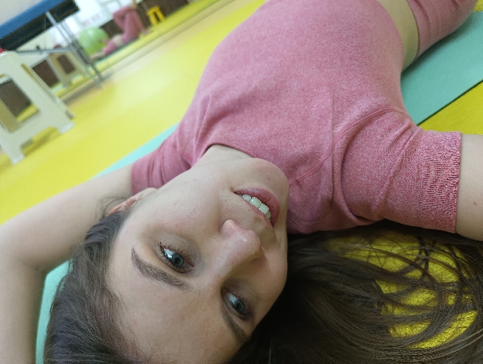 - "A woman with long brown hair lies on a yellow and green mat, wearing a pink long-sleeved shirt" by FM-mH2Cn2, licensed under CC BY 4.0