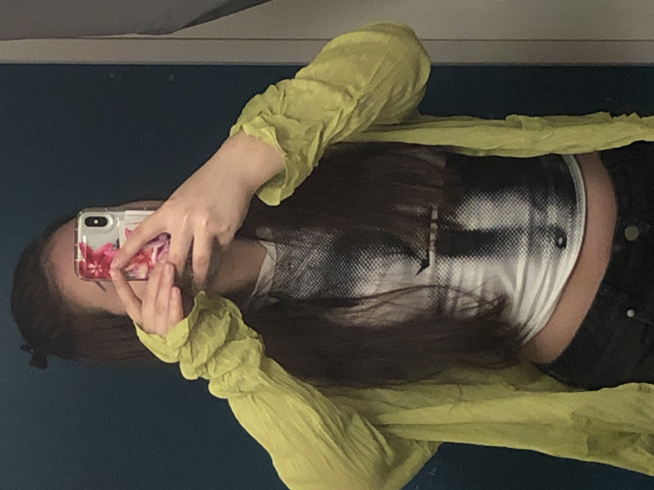 A person is taking a selfie. They're wearing a yellow, textured long-sleeved top. Underneath, they have on a white tank top with a black and white graphic. Their long, dark hair covers part of the top. They are also wearing dark-colored pants. The background appears to be a solid, dark blue color, possibly a wall. The phone they are holding has a clear case with pink and red flowers.