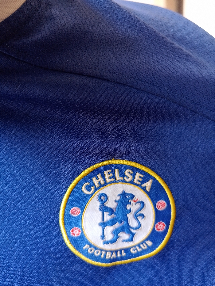 - "The image displays a close-up, slightly oblique view of a royal blue fabric, likely a sportswear garment, featuring an embroidered Chelsea Football Club crest" by FM-ivfc33, licensed under CC BY 4.0