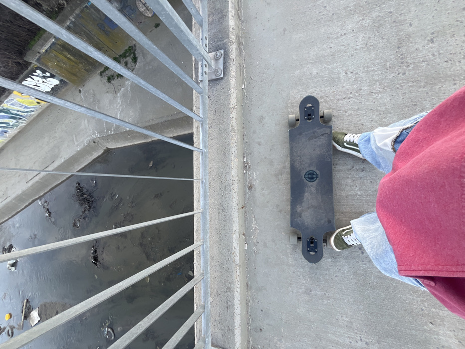An overhead photograph depicts a person standing on a concrete bridge or overpass in Sofia, Bulgaria, looking down into a polluted concrete canal. The foreground shows the lower torso, legs, and feet of the individual. The person wears a reddish-maroon top, light blue patched jeans, and olive green low-top sneakers with white laces. Directly in front of their feet rests a black longboard or electric skateboard, bearing a white circular logo with an 'H' symbol. The midground features a gray concrete bridge railing with diagonal metal bars. Several cigarette butts are visible on the concrete ledge directly beneath the railing. The background reveals a narrow, dark, murky waterway, heavily laden with trash including plastic bottles, various debris, and organic matter. The canal banks are constructed from concrete. The far bank displays colorful graffiti on a concrete wall and sparse, dry vegetation above. The scene is illuminated by natural light, casting no distinct shadows, suggesting an overcast or high-sun condition.