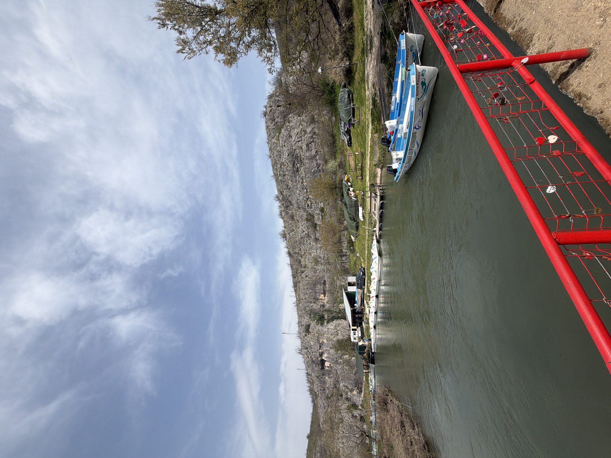 The scene shows a river running alongside a rocky cliff in Lukovit, Bulgaria. Several small, blue and white passenger boats are docked along the riverbank. A red pedestrian bridge with locks attached to its railings spans part of the river. The sky is partly cloudy.