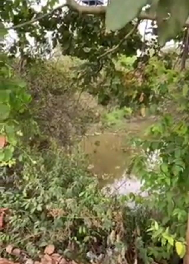 body of water surrounded by dense vegetation. The water appears murky, with visible debris floating on the surface. Trees and bushes crowd the banks, obscuring much of the view. A small structure, possibly a water tank, is visible in the distance above the treeline. The scene is shot from a ground-level perspective, with the camera panning slightly to the right.