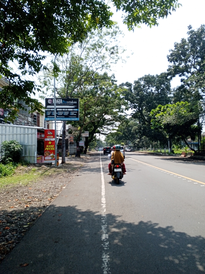 The image captures an outdoor street scene under clear daylight. A paved road with a white solid line on its left shoulder and faded yellow dashed lines separating lanes extends into the distance. The foreground features a dirt and gravel shoulder on the left, adjacent to the road, with shadows of overhead foliage cast upon it and the road. On the left side of the road, a small, metallic, shed-like structure is visible, likely a food stall, with a red sign attached displaying white text "GORENGAN & NASI PECEL" (Indonesian for Fried Snacks & Rice with Peanut Sauce). Further down the road on the left, a utility pole supports a larger rectangular sign that reads "AGIA Percetakan" (Indonesian for AGIA Printing). These signs indicate the location is in Indonesia. Beyond these structures, other buildings and dense green trees line the street. Two individuals are observed riding a dark-colored scooter away from the camera. The driver wears a red top and a light-colored head covering or helmet. The passenger behind wears a yellow-brown garment and a head covering. They are positioned on the road, to the right of the white shoulder line. In the mid-ground and background, additional vehicles, primarily cars, are visible traveling in the same direction on the road. The entire scene is framed by the lush green canopy of trees on both sides of the road and overhead.