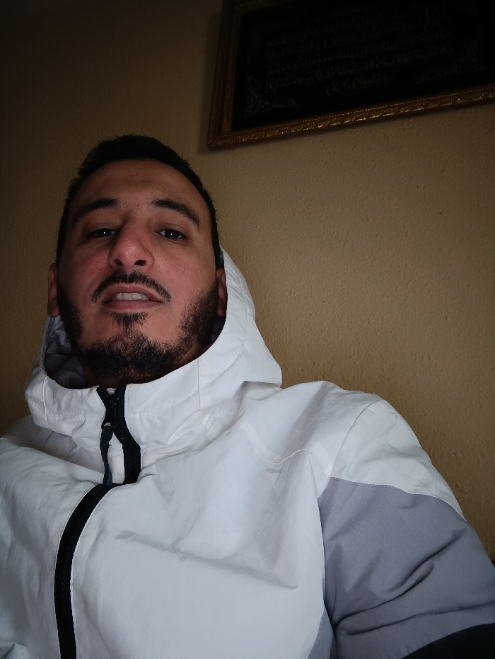 A selfie shows a man with dark hair and a beard. He wears a white and grey hooded jacket. The wall behind him is a muted beige color. A framed picture with dark content hangs in the upper right corner. The man’s gaze is directed toward the camera. The lighting is soft, illuminating his face and jacket.