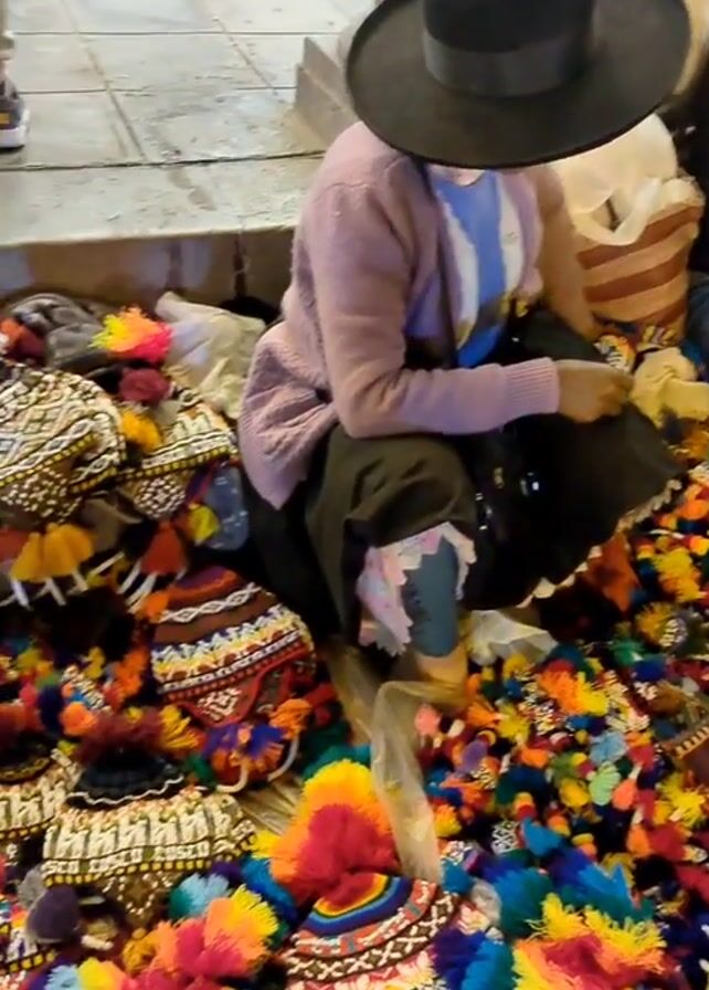 three women sitting on the ground on a stone tiled surface surrounded by colorful hats. The first woman, wearing a wide-brimmed black hat, a light purple sweater, and dark pants, sits near a stone pillar and handles a black bag. The hats in front of her are brightly colored with geometric patterns and pom-poms. To her right, another woman, also wearing a hat, but of a beige color, is partially visible from the back. To the right of the second woman, a third is sitting and arranging more hats. The hats are spread out in a pile, with a few scattered around on a blue tarp in the background. There are a few people walking in the background.