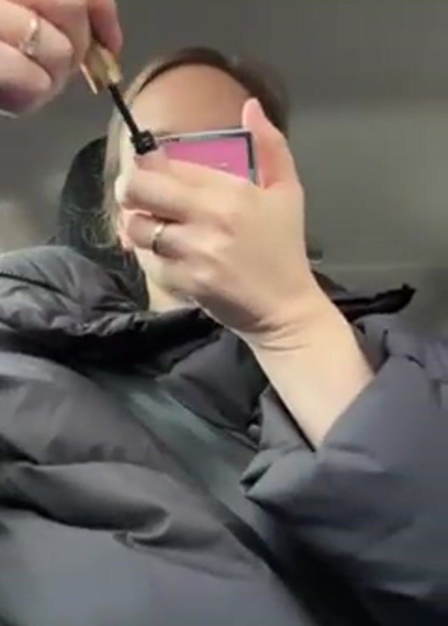 A woman wearing a black puffy jacket and a seatbelt is inside a car. She holds a small, rectangular makeup compact in her right hand and a mascara wand in her left. She applies mascara to her eyelashes, using the compact as a mirror. The interior of the car is visible, including the gray headliner.
