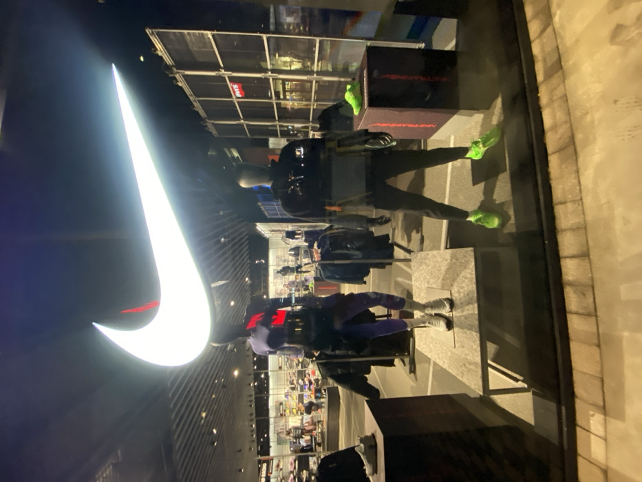 A Nike store display featuring two mannequins. The first mannequin is wearing black athletic wear with bright green shoes. The second mannequin is wearing purple athletic wear with white shoes. A large, illuminated Nike swoosh logo dominates the left side of the frame. The store interior with shelves of merchandise is visible in the background. The shot is taken through a storefront window reflecting the street outside.
