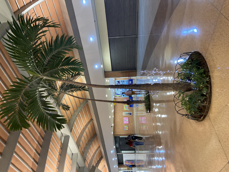 Inside a mall, a tall palm tree stands as a decorative centerpiece