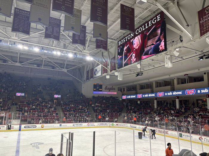 An indoor ice hockey arena, likely Boston College's, is packed with spectators