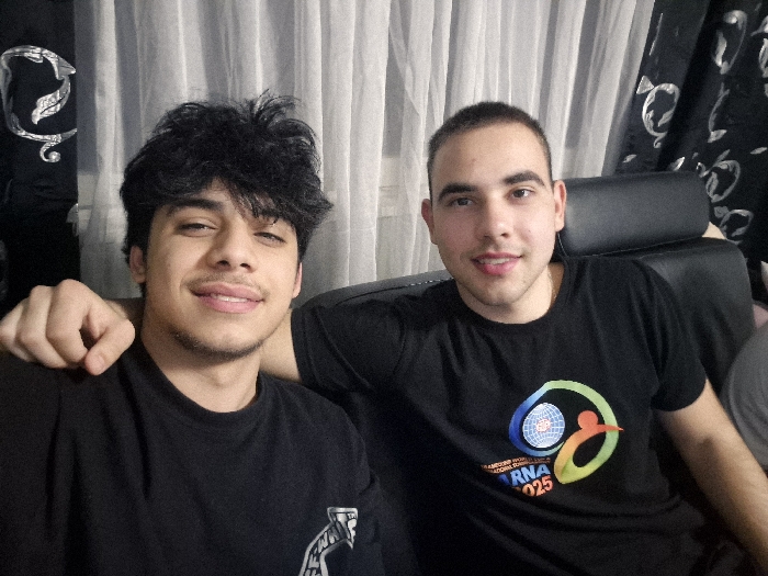 The image displays two young adult males situated indoors. The individual on the left has dark, curly hair and light facial stubble, wearing a dark t-shirt with a partially visible graphic. His left arm rests on the right shoulder of the second individual. The individual on the right has short, buzzed hair, wearing a dark t-shirt featuring a colorful circular logo that includes a globe graphic and text such as "TRANSFORMING WORLD..." and "RNA 2025." Both individuals are smiling and looking towards the camera. They appear to be seated, with a dark headrest visible behind the individual on the right. The background consists of light-colored, vertically pleated curtains to the left and darker curtains with a repeating silver, stylized pattern to the right. The specific location within the city of Targovishte, Bulgaria, is not discernible from the visual information presented in the image.