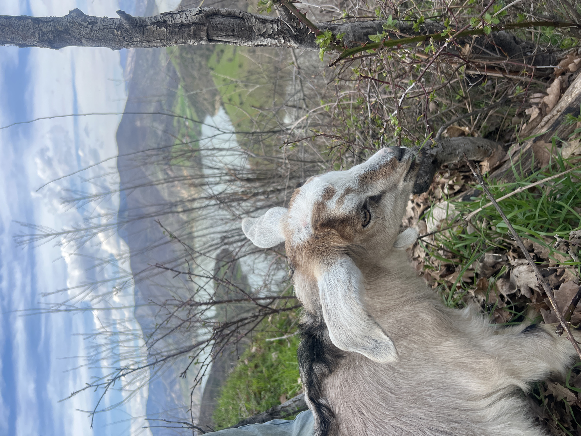 - "A goat stands near a bramble bush, and in the background are mountains and a lake" by FM-KAq9q1, licensed under CC BY 4.0