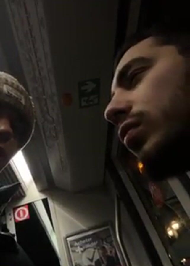 Two men are on what appears to be public transportation, maybe a tram. The man on the right side of the frame is speaking to the camera, which is held low and pointed upwards. The second man stands to the left and is partially visible. The man on the right has dark hair and a close-cut beard. He looks tired. There's an advertisement posted nearby, a red circle with a line through it, and a green emergency exit sign.