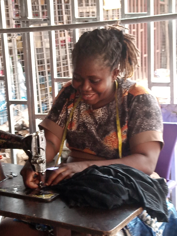 An adult female is depicted operating an older model sewing machine in what appears to be a commercial or workshop setting in Obosi, Nigeria