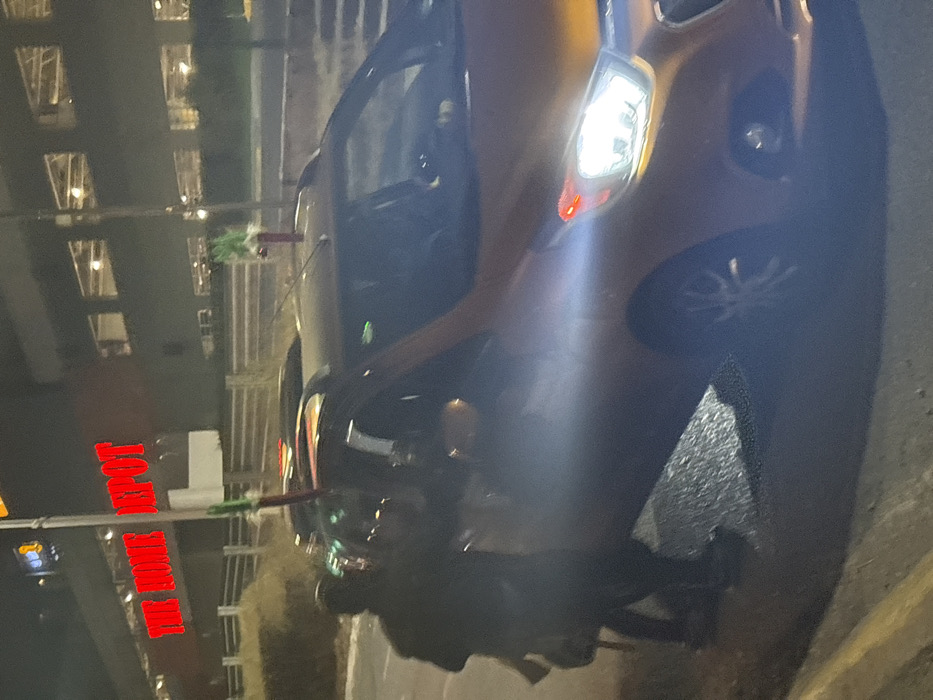 A car parked at night is illuminated by its headlights. The vehicle's details, including the tire and door, are visible. In the background, a building with numerous windows is reflected in the car's surface. "The Home Depot" sign is also visible, indicating the location's proximity to the store. A person stands next to the car.