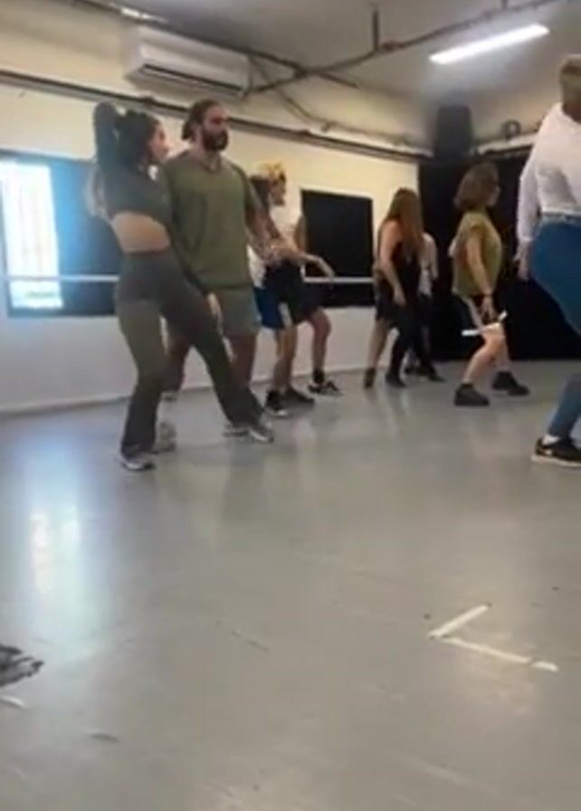 group of about 10 people practicing dance moves in a brightly lit dance studio. The studio has a gray floor, white walls, and an air conditioner mounted high on one wall. There are also a few windows. Most of the participants are adults, though a couple appear to be younger teenagers. The dancers are dressed casually in athletic wear, and all are wearing sneakers. They are spaced across the room as they practice a routine to music that plays in the background. The dance instructor, a bearded man in a green shirt and shorts, occasionally adjusts the participants' positions or demonstrates the moves.