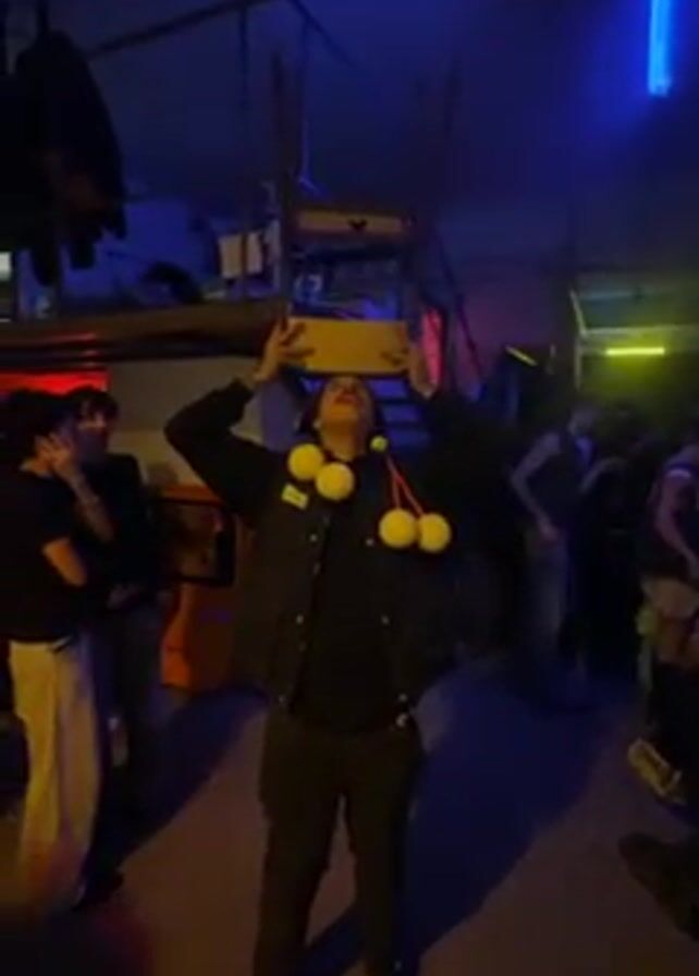 A person wearing a black jacket with large white spheres hanging from the chest, black pants, and black shoes is holding a rectangular wooden block above their head in a dimly lit room. They are looking up at the block, and a small group of people is standing around them, some talking and some watching. The room appears to be a loft or warehouse space with a staircase in the background and various pieces of furniture and equipment scattered around. There is a blue light fixture on the ceiling.