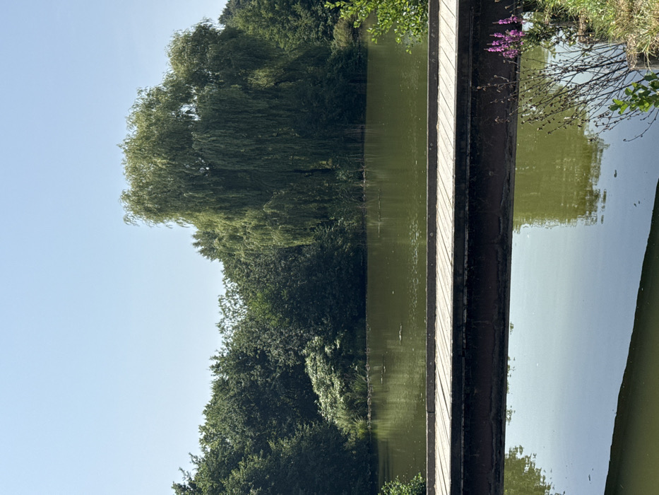 The image presents a static outdoor scene in Lenningen, Luxembourg, under a clear, light blue sky. A body of dark green, calm water occupies the central and lower portions of the frame, reflecting the sky and surrounding elements. A light-colored wooden structure, identifiable as a bridge or dock section, spans horizontally across the mid-ground. This structure features multiple wooden planks oriented perpendicular to its length, secured by visible fasteners, and is supported by a darker, likely structural beam, which is also reflected in the water directly beneath it. The background consists of a dense wall of various dark green deciduous trees and bushes. A large, mature weeping willow tree with abundant, pendant foliage is prominently situated on the far bank, towards the right side of the frame, with its form visibly reflected on the water's surface. Along the far waterline, particularly near the willow, tall reeds or grasses emerge from the water. In the lower right foreground, sparse, lighter green vegetation and several distinct purple flowering plants are visible. No human or animal subjects are present.