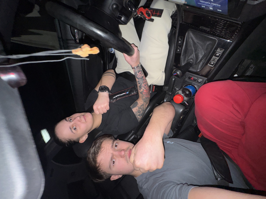 Inside a vehicle at night, in Malo Buchino, Bulgaria, a young adult male and female are seated. The male occupies the driver's seat, wearing a grey t-shirt and red sweatpants. His right fist is clenched and raised towards the camera. The female is in the passenger seat, wearing a black t-shirt and light-colored pants. Her left arm is extensively tattooed, and her left fist is clenched near her shoulder. She holds the steering wheel with her right hand. Both individuals are looking towards the camera. A plastic bottle with a red cap and dark liquid is in a cup holder on the center console. Keys with a red "8" shaped keychain and another red tag hang from the ignition. An orange, irregularly shaped air freshener or charm hangs from the rearview mirror area. The vehicle's interior features a manual gear shift and a carbon fiber pattern on the center console. The external environment is dark.