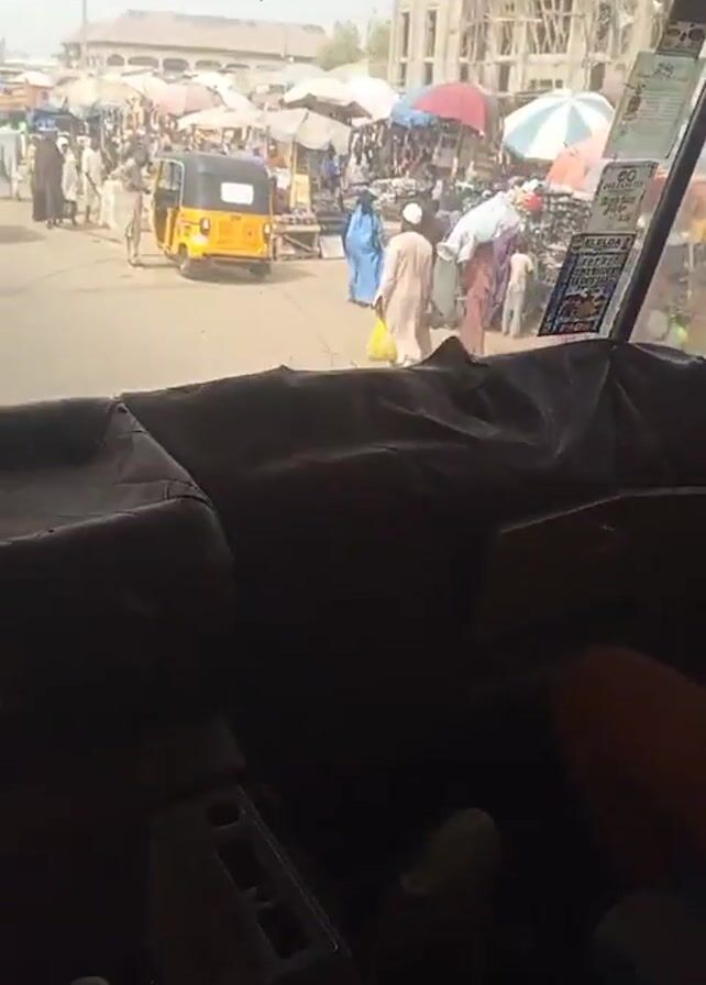 view from inside a vehicle, likely a bus, as it navigates through a busy market area. The market is filled with people, vendors, and various modes of transportation, including yellow auto rickshaws. Many people are wearing traditional clothing. The streets are dusty and crowded. The vehicle is driving on a paved road, and the footage captures both the interior of the vehicle (dashboard, seats) and the exterior environment. The lighting appears overcast. The video depicts a bustling commercial environment in what seems to be an urban or semi-urban setting.