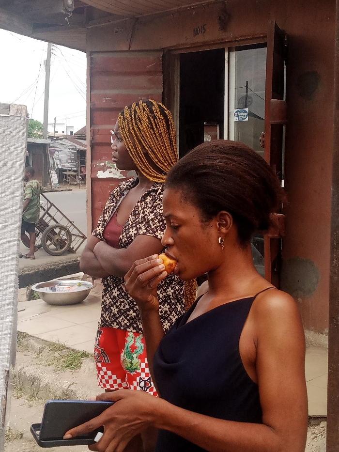 This image depicts an urban street scene in Aba, Nigeria. In the immediate foreground, a woman with dark skin wears a dark blue spaghetti-strap top, holds a black smartphone in her left hand, and is eating a light-brown, fried food item held in her right hand. Behind her and slightly to the left, a second woman with dark skin and long, bright yellow-gold braids stands with crossed arms, wearing a patterned top over a red undershirt and red patterned shorts. She is looking towards the left side of the frame. Both women are positioned in front of a reddish-brown corrugated metal structure, part of a building or kiosk, marked "NO 15" above a doorway. In the background, beyond a paved area and a gutter, a man in a green shirt and dark shorts stands next to a two-wheeled metal cart on a street. Other simple buildings and structures are visible along the street, one featuring a large poster of a man's face. A silver basin is on the ground near the street, and the sky is overcast. A light-colored, textured vertical element partially frames the left side of the image.